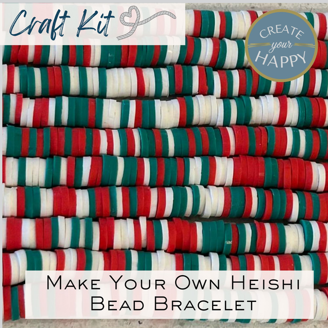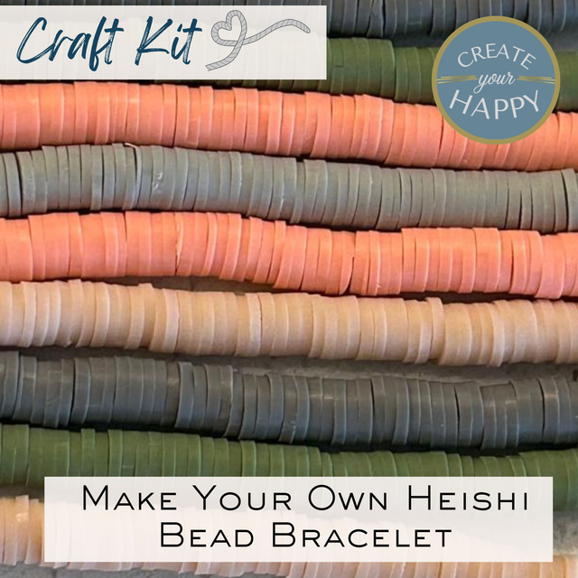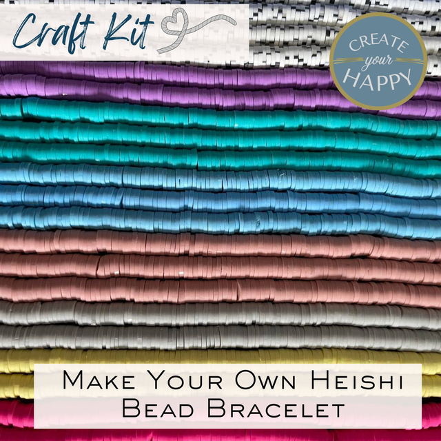 Make your own Heishi Bead bracelet, with a mixture of colours and additional decorative beads! You will make your design on elastic, and can make your bracelet to fit your wrist. Your kit also comes with written and picture instructions.